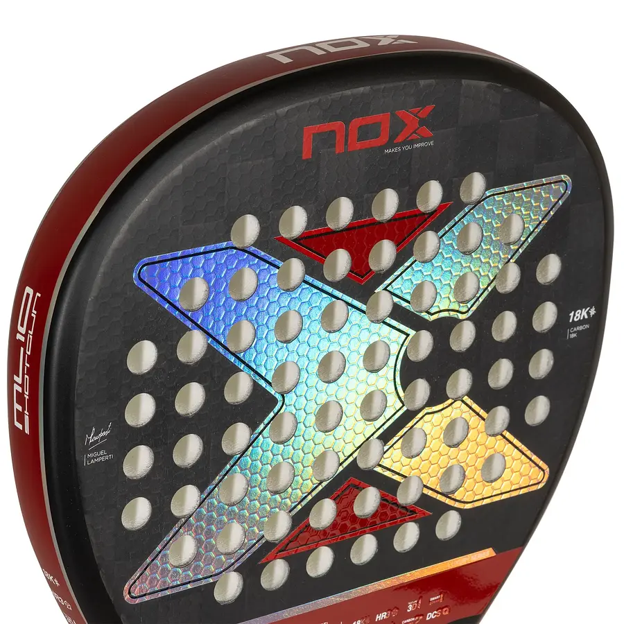 Diseñada junto a Miguel Lamperti para la temporada 2024 para todos aquellos jugadores que buscan imprimir la máxima agresividad a sus golpes de ataque con un formato de pala en forma de diamante. Nuevo molde y nuevas tecnologías para que sientas hoy el pádel del futuro. Eso sí, con la goma HR3 clásica de NOX, la preferida por el Canoso de Bahía Blanca.